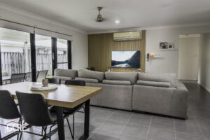 At the heart of the home is a spacious open-plan living and dining area, creating the perfect place for families to gather, entertain, or simply relax at the end of the day. The kitchen overlooks the living area, making meal preparation easy while still being part of the conversation.